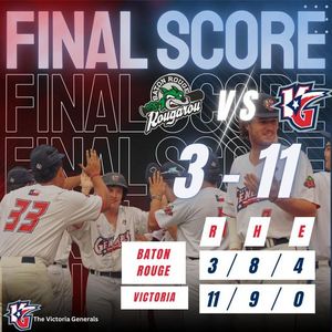 July 24, 2024 – For the last time in the 2024 Texas Collegiate League regular season, the Victoria Generals battled the Baton Rouge Rougarou on an overcast night at Riverside Stadium. The Generals defeated the Rougarou 11-3 and are in the driver’s seat heading into the playoffs with home-field advantage clinched throughout the postseason.